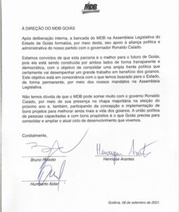 “Estamos convictos de que esta parceria é o melhor para o futuro de Goiás, pois ela está sendo construída por ambos lados de forma transparente e democrática, com o objetivo de consolidar uma ampla frente política que certamente vai desempenhar um grande trabalho em benefício dos goianos”, diz a carta partidária.