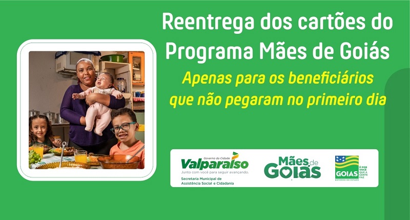 O Mães de Goiás, programa de transferência de renda do Governo do Estado de Goiás, em parceria com o Governo da cidade de Valparaíso do Goiás e sua Secretaria Municipal de Assistência Social e Cidadania, chega neste mês de Maio com a 4ª entrega dos cartões para os beneficiários que não conseguiram retirar o seu benefício nos eventos anteriores.