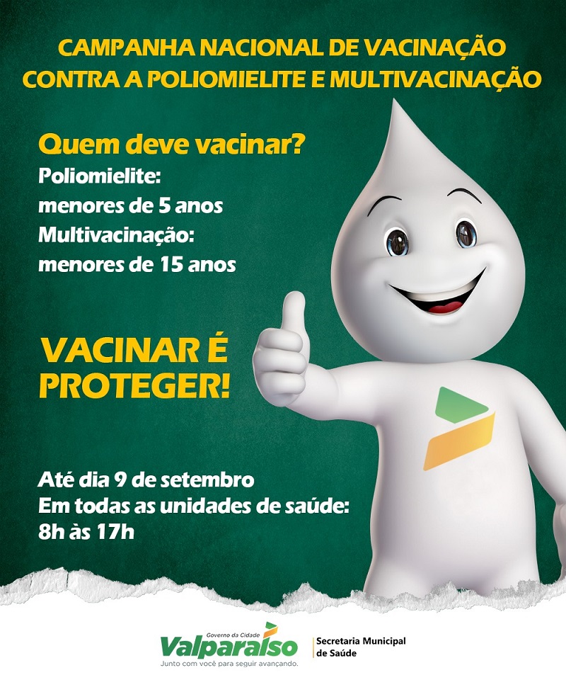 O Governo de Valparaíso de Goiás, por meio da Secretaria Municipal de Saúde, deu início à campanha de vacinação de crianças e adolescentes contra a poliomielite, conhecida também como paralisia infantil, e à multivacinação que visa atualizar a caderneta vacinal contra diversas doenças.