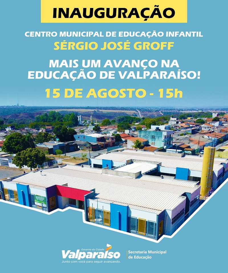 O Governo Municipal de Valparaíso de Goiás segue com as conquistas para a comunidade valparaisense, com olhares que se projetam no horizonte de novos tempos para a efetivação do processo de cidadania. Nesta segunda-feira, dia 15, às 15h, será inaugurado o Centro Municipal de Educação Infantil Sérgio José Groff, na rua 33, Etapa B. A unidade escolar irá receber estudantes entre 3 e 5 anos de idade e a expectativa é atender até 250 crianças.